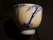 A sometsuke (blue-and-white) small bowl featuring a bamboo motif, dating from the Meiji to early Shōwa period.